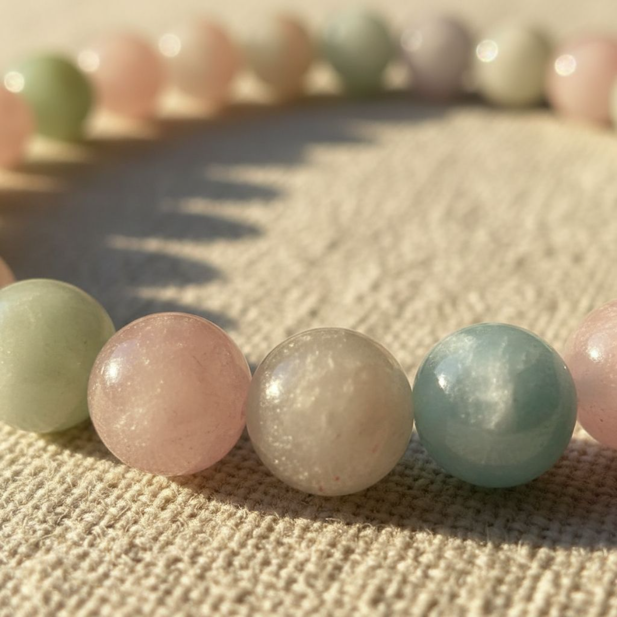 Her boncuk tek tek dizilir, her detay özenle tamamlanır; taşların doğal dokusu korunur, ışıltısı kaybolmadan zarafetle bir araya getirilir.