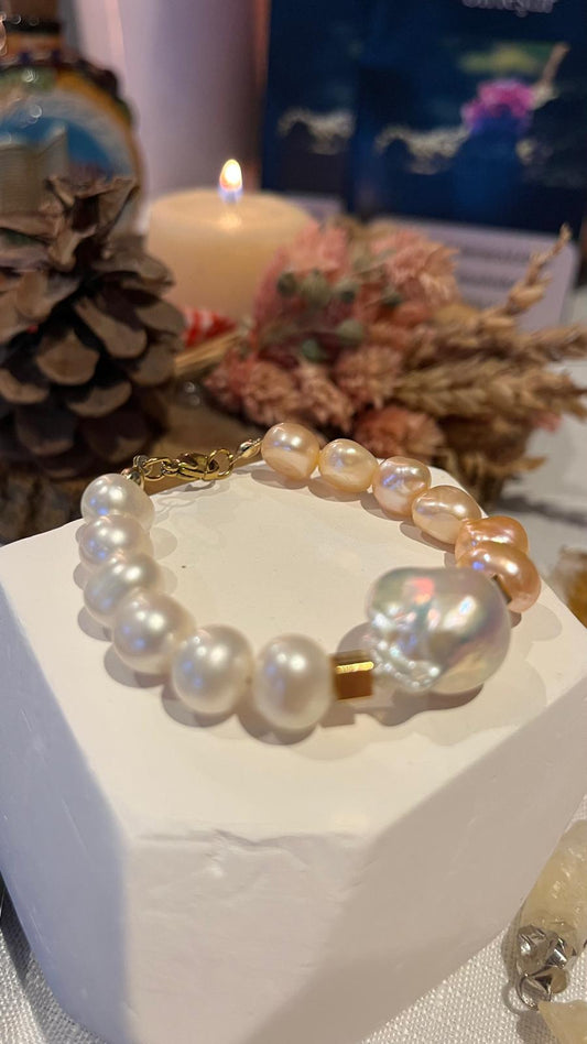 Gerçekten beklediğimden çok daha şık duruyor. Kare incilerin doğal parıltısı bilekte çok zarif .