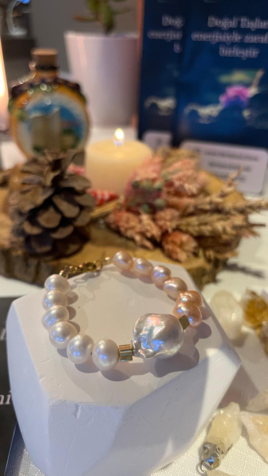Gerçekten beklediğimden çok daha şık duruyor. Kare incilerin doğal parıltısı bilekte çok zarif .
