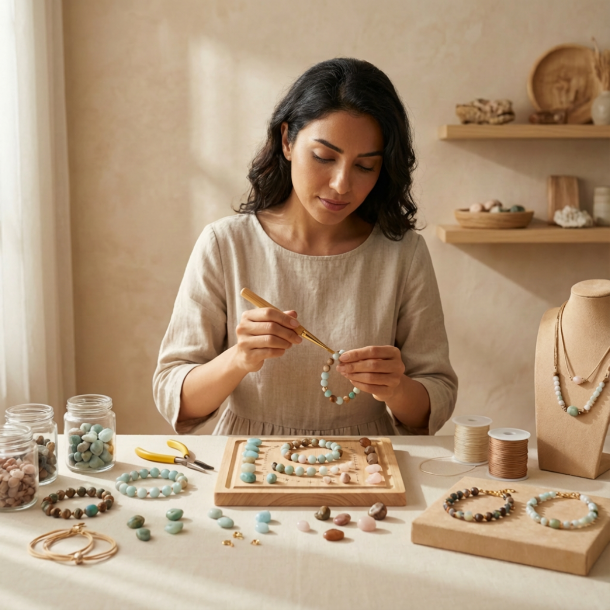 Her boncuk tek tek dizilir; taşların doğal dokusu, tonu ve ışığı korunarak tasarıma dahil edilir.