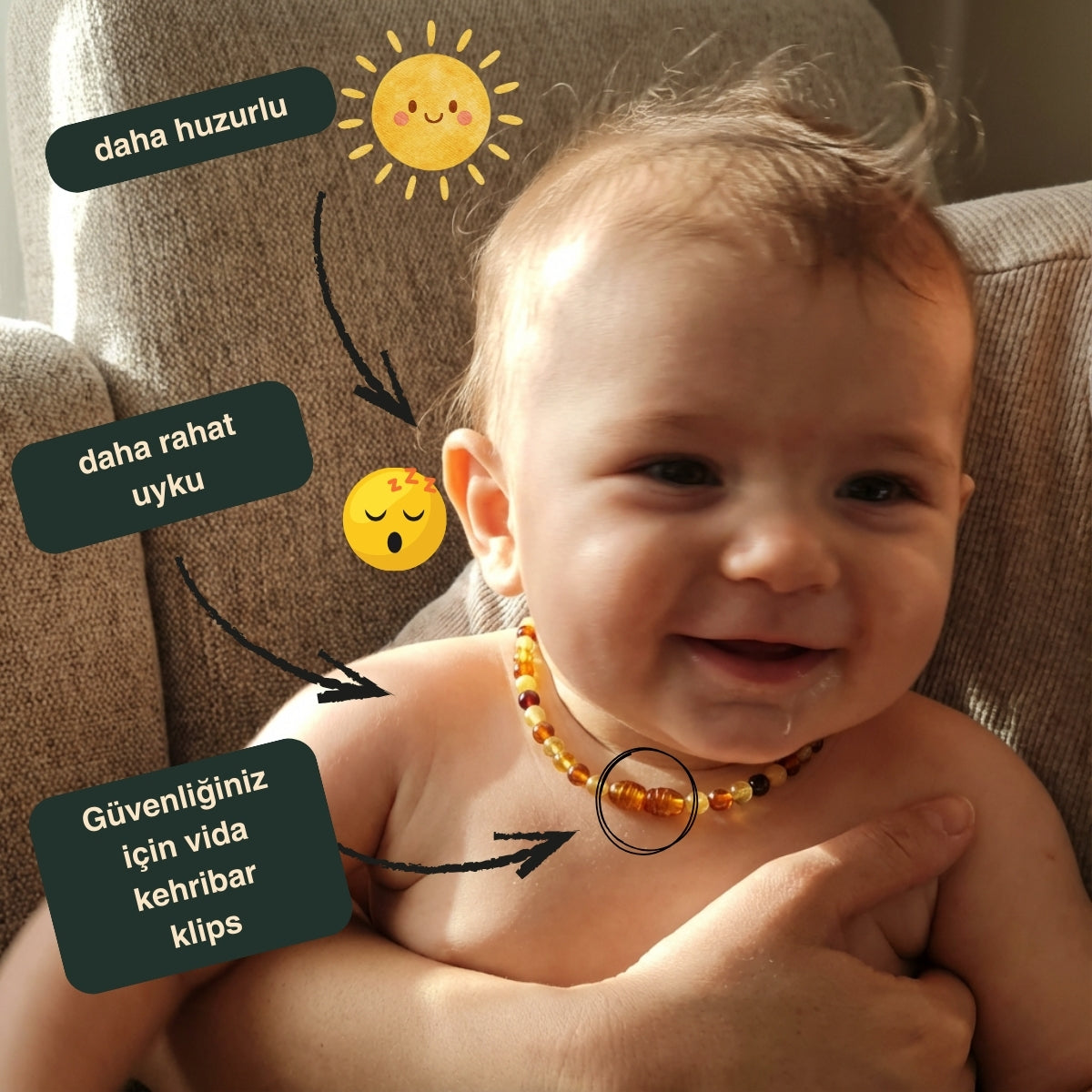 TerraSoul bebek kehribar kolyeleri, sade tasarımı ve doğal yapısıyla bu dönemde annelere güven hissi verir. Kimyasal ürünlere yönelmeden önce, daha doğal ve sakin bir alternatif arayan anneler için düşünülmüştür.