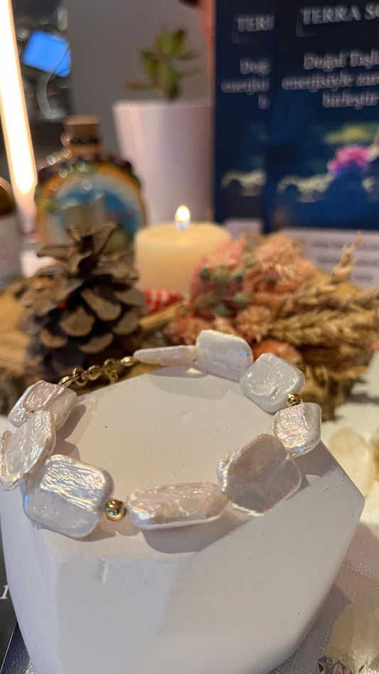 Gerçekten beklediğimden çok daha şık duruyor. Kare incilerin doğal parıltısı bilekte çok zarif .
