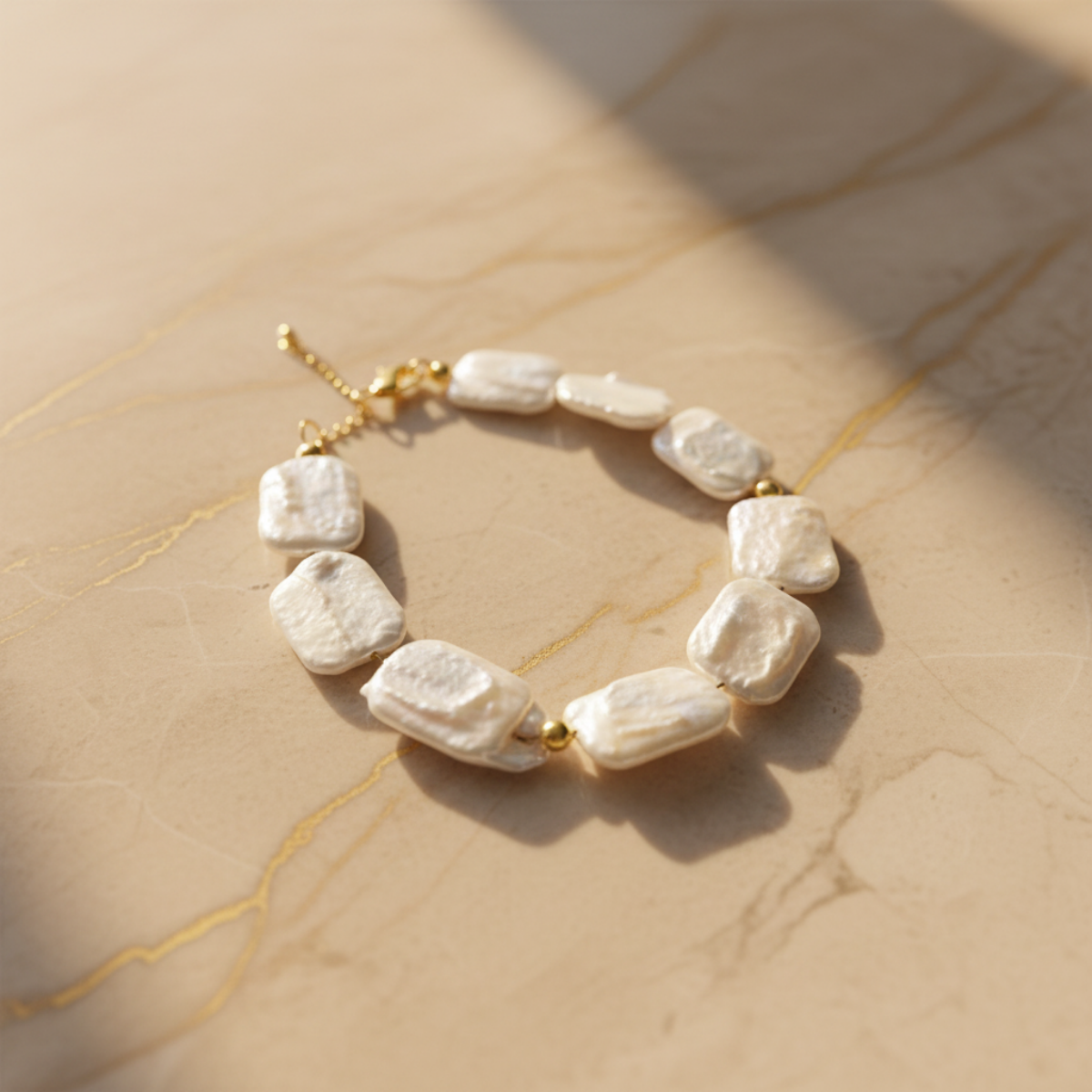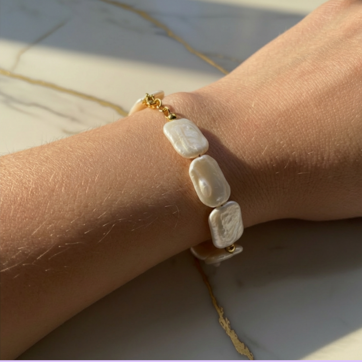 Gerçekten beklediğimden çok daha şık duruyor. Kare incilerin doğal parıltısı bilekte çok zarif .
