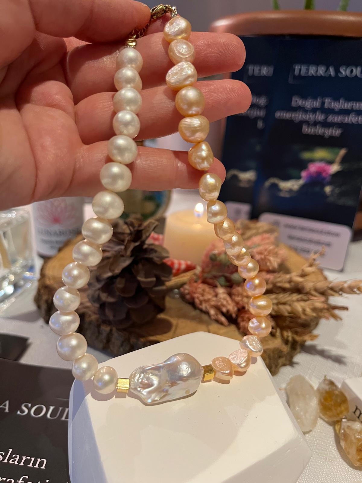 Bileklikte kullanılan inciler çok kaliteli. Günlük kullanımda da özel günlerde de şık bir tamamlayıcı oluyor. Tasarım gerçekten temiz bir işçilikle hazırlanmış.