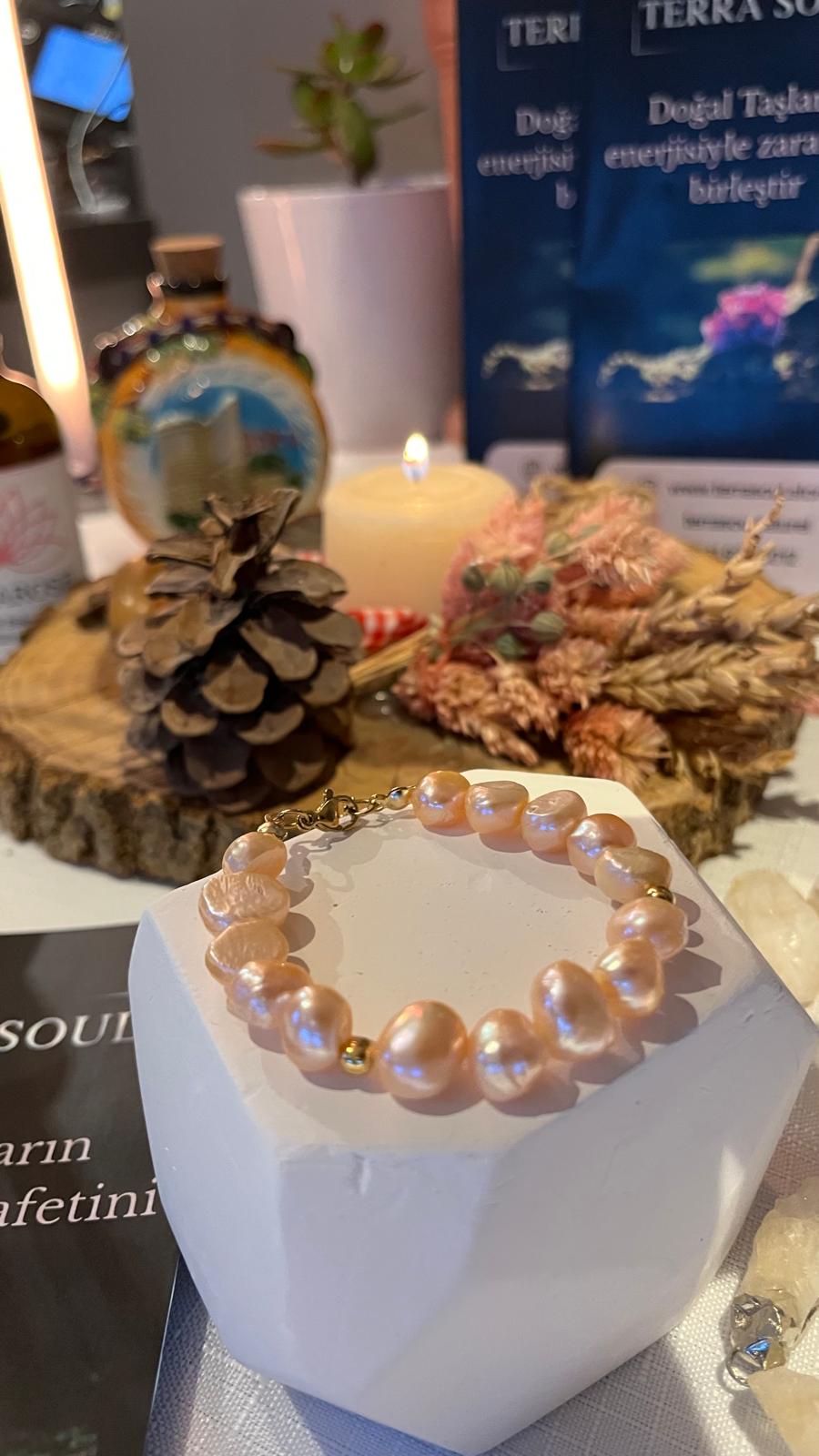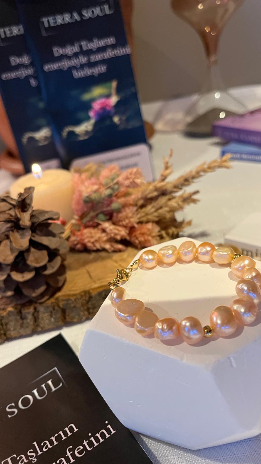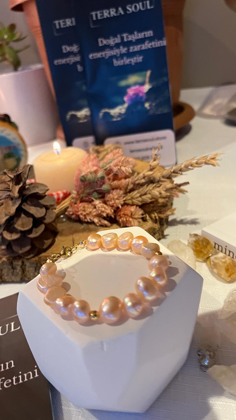Gerçekten beklediğimden çok daha şık duruyor. Kare incilerin doğal parıltısı bilekte çok zarif .